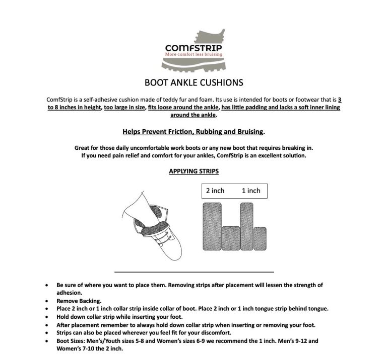 Comfstrip is a cushion designed to help your boots fit better. They're made to prevent friction, rubbing and bruising. Its use is intended for boots or footwear that is. 3 to 8 inches in height. Too large in size. Fits loose around the ankle. Has little padding and lacks a soft inner lining around the ankle. If your boots fit ok, but you still have ankle issues. Putting Strips in them may cause a tight fit. Comfstrip may not be your solution.